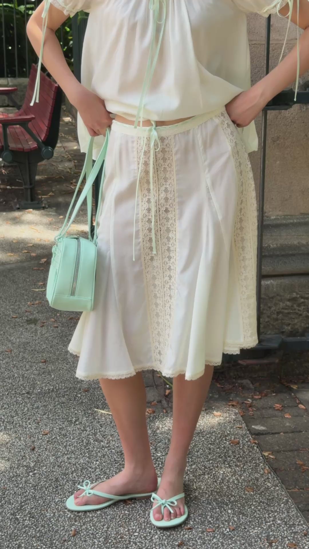 Mid-length skirt with alternating lace and sheer panels. Finished with a ribbon tie at the waist and lace trim along the hem.