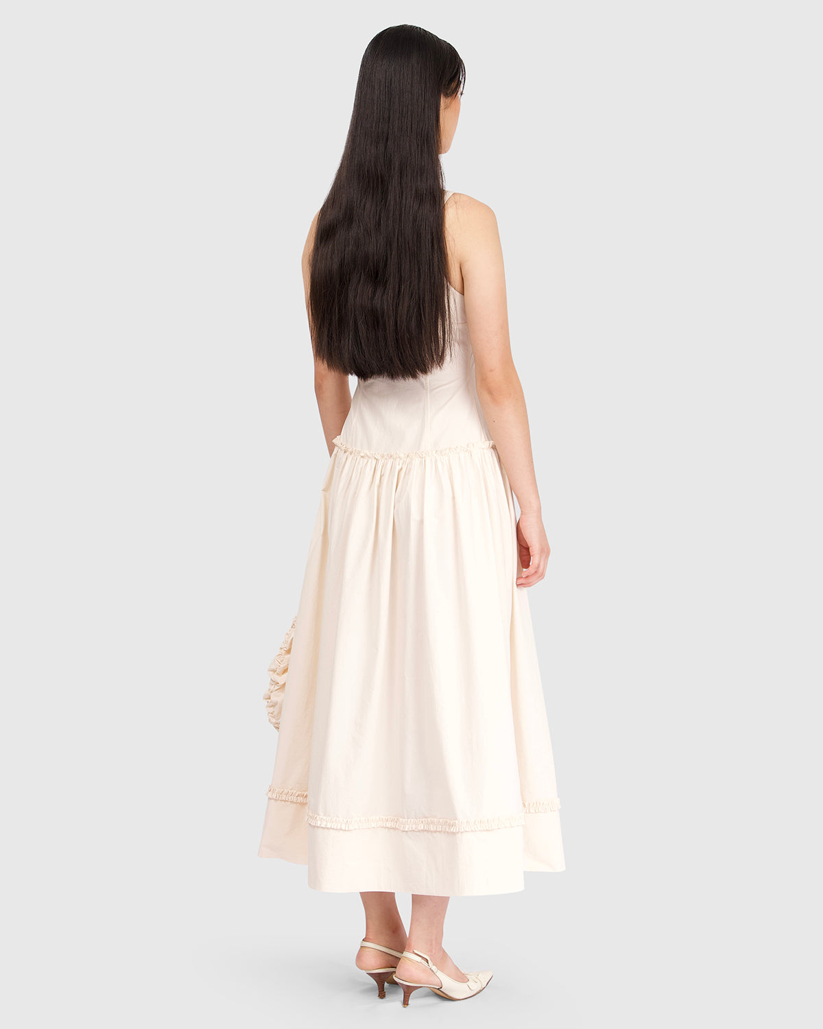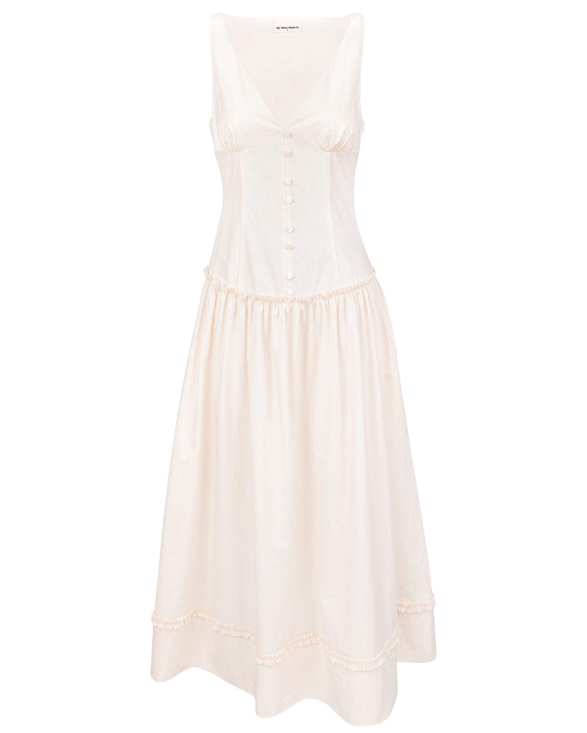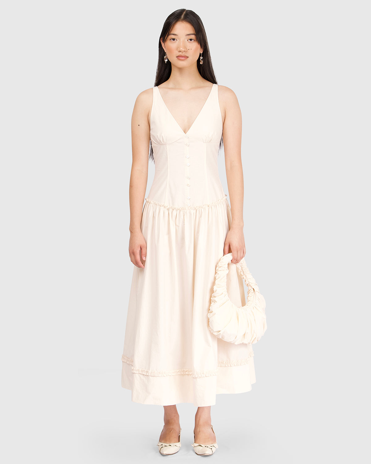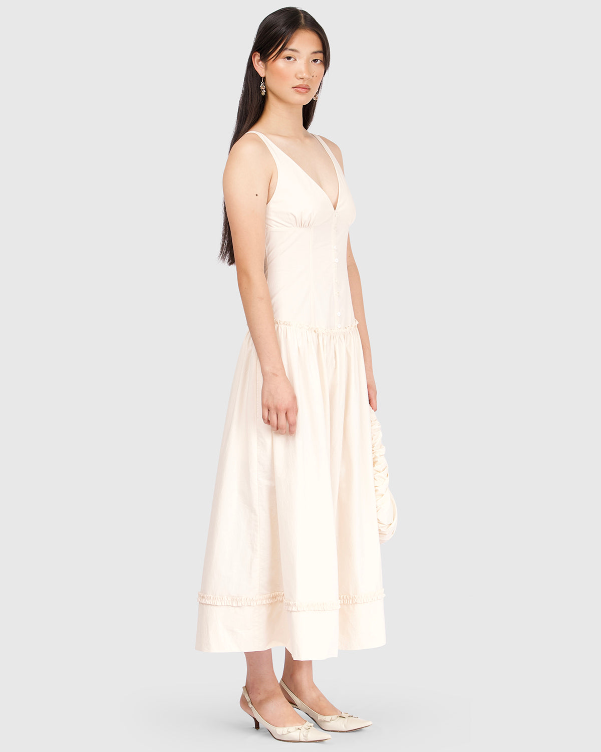 Romantic V-Neck Maxi Dress With Side Seam Pocket. Assorted Button Detail Along Front Bodice. Gathered Skirt With Ruffle Trim At Hem. Zipper Closure Along Side.