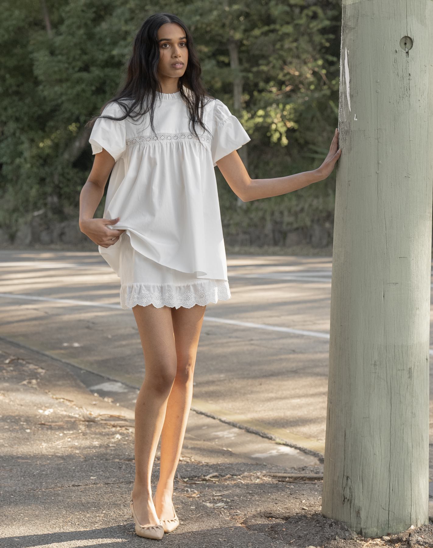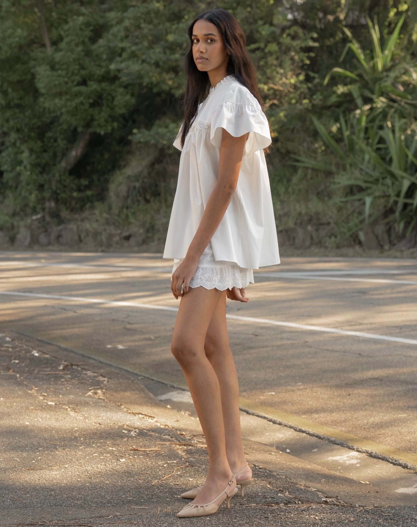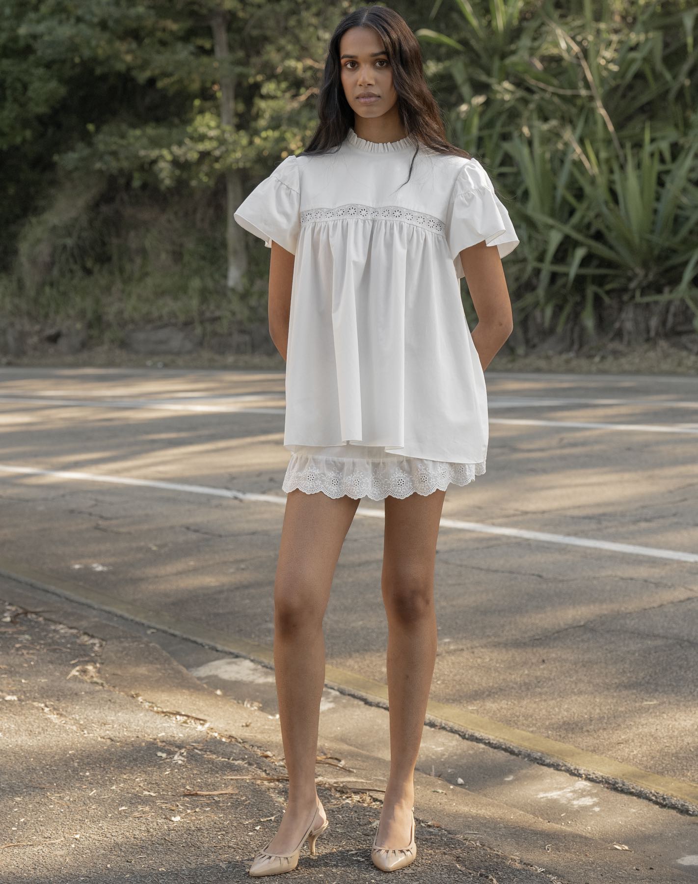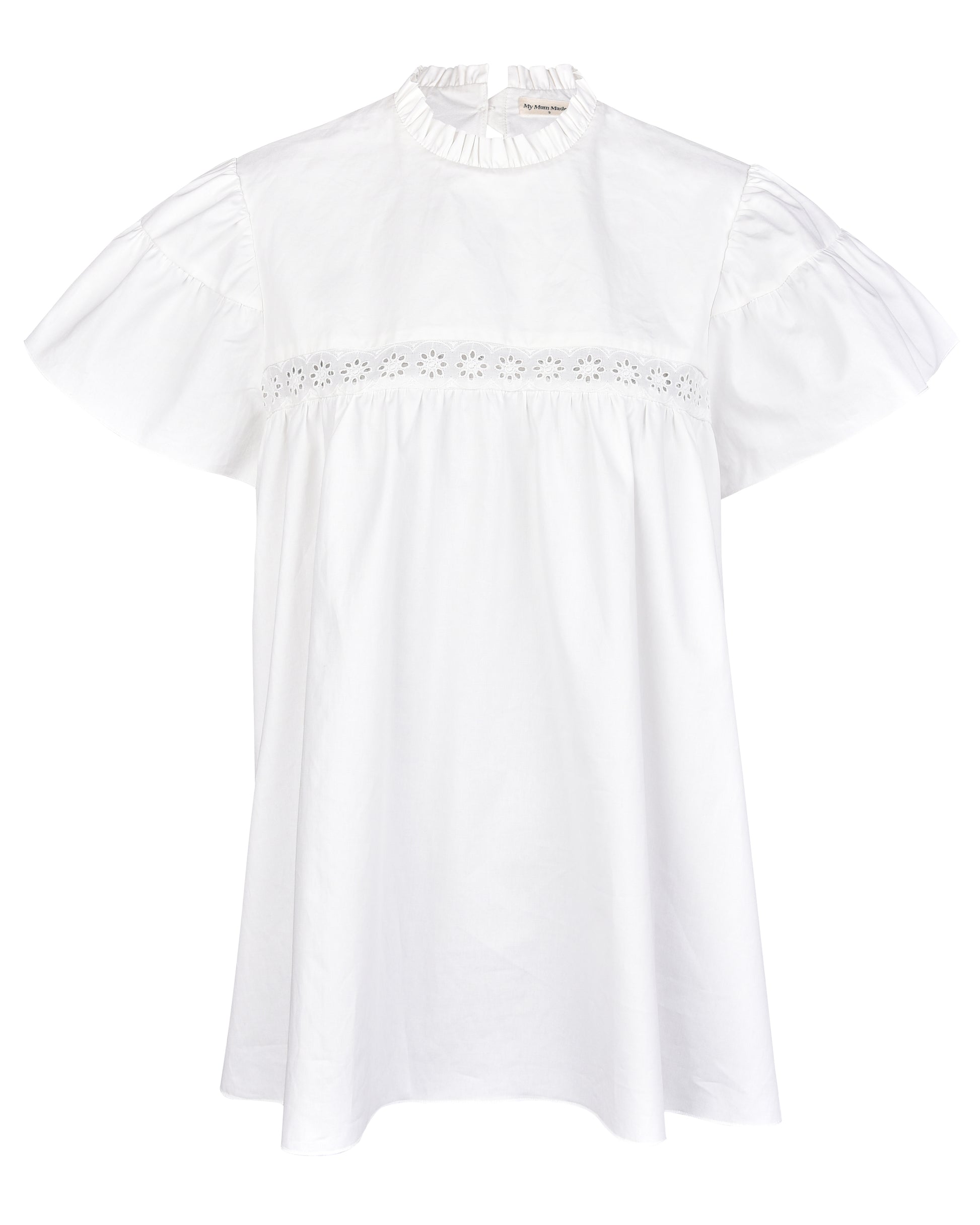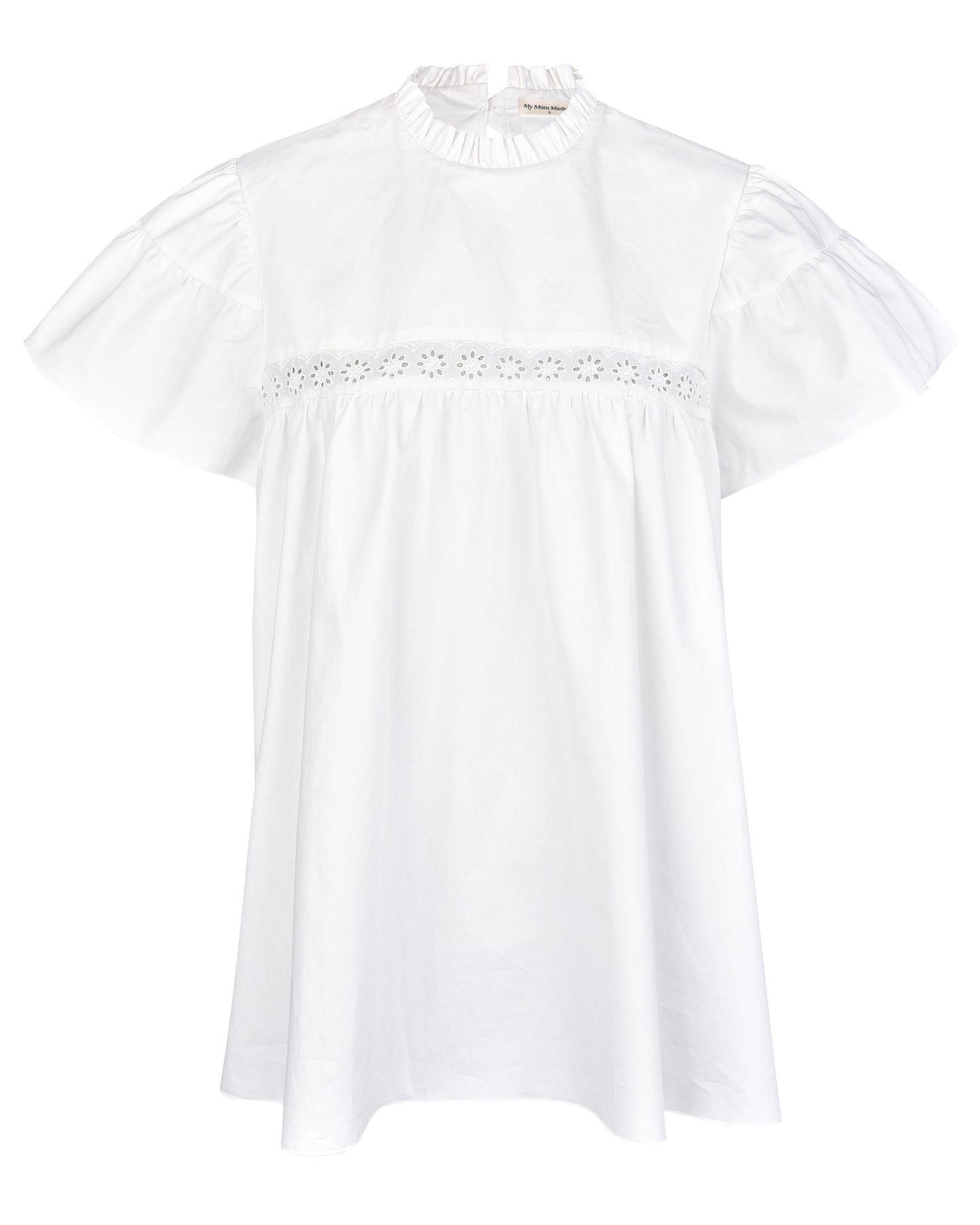 Organic cotton longline babydoll blouse with lace detail at bust. Double layer puff style cap sleeves. Button closure at back.