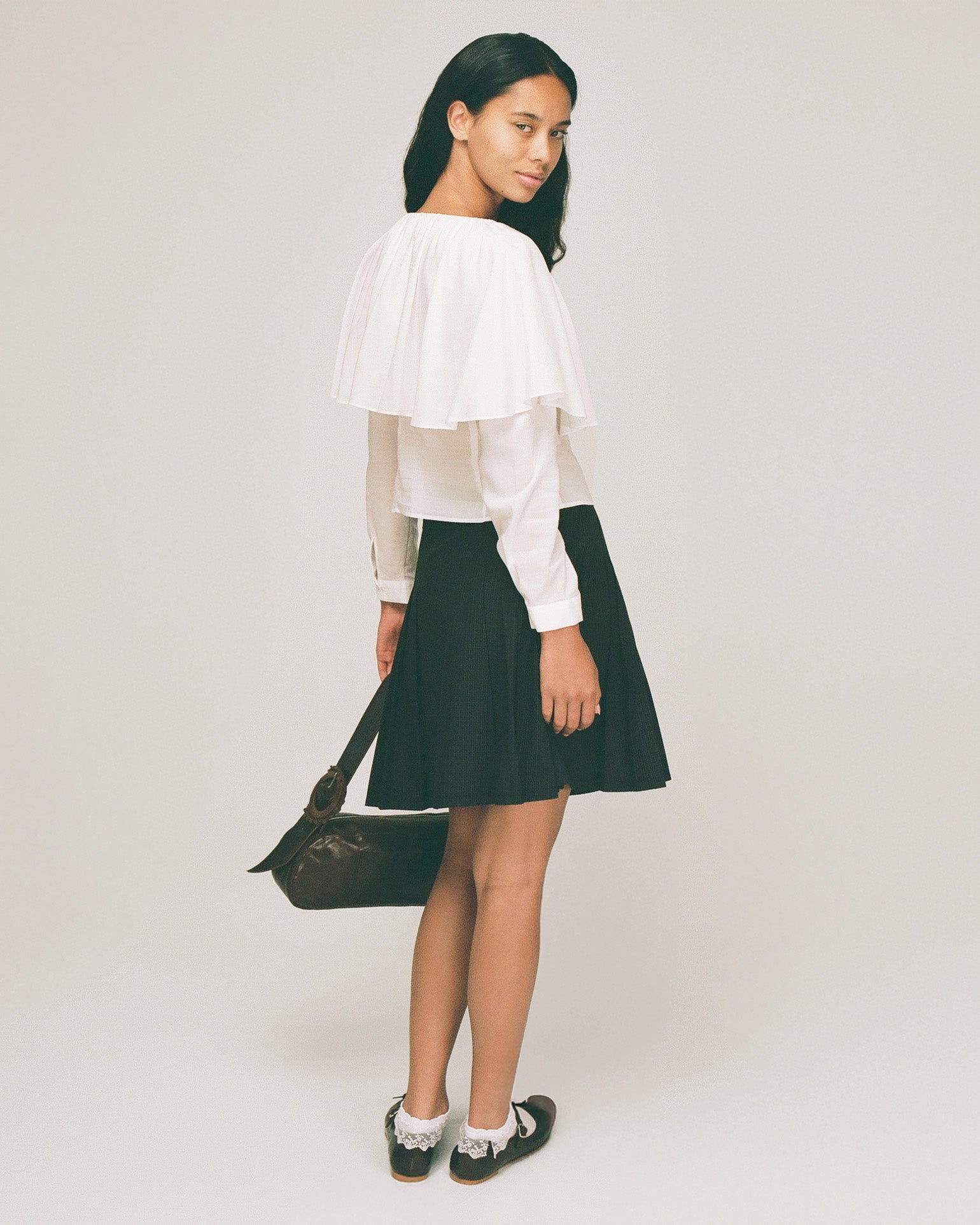 Ruffle cape collar cascading over the blouse.