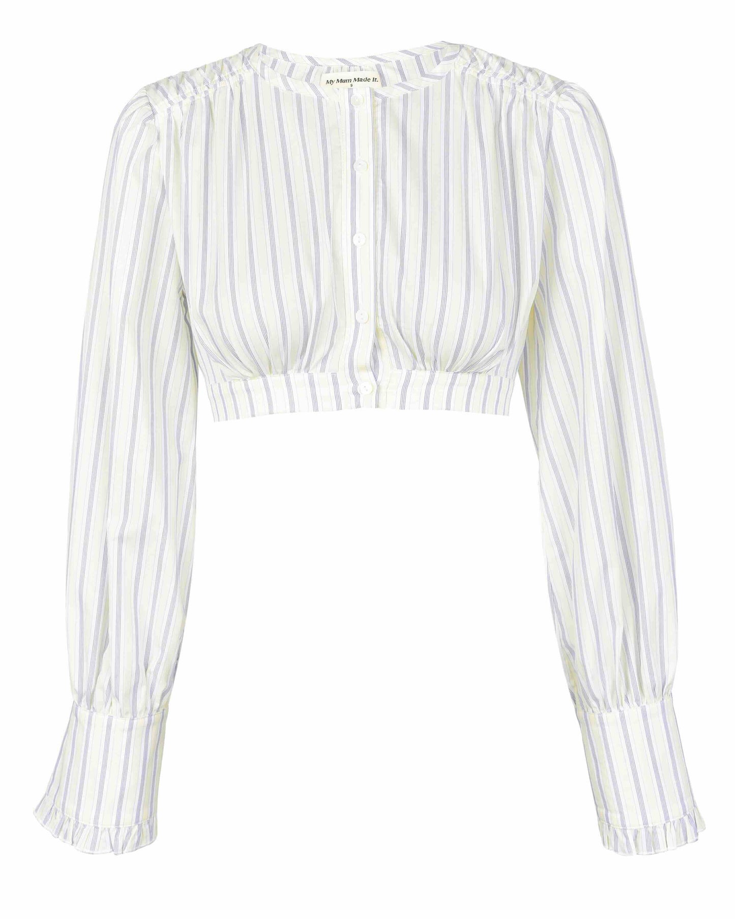 Long Sleeve Button-Up Cropped Blouse. Frill Detail At Sleeve Cuff.