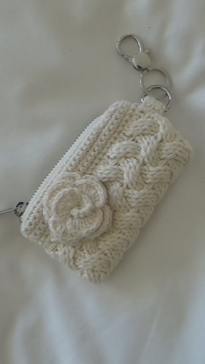 Hand-crafted essentials pouch. Textured knit with in-house hand-crocheted floral appliqués. Soft, durable, and perfect for storing small treasures.