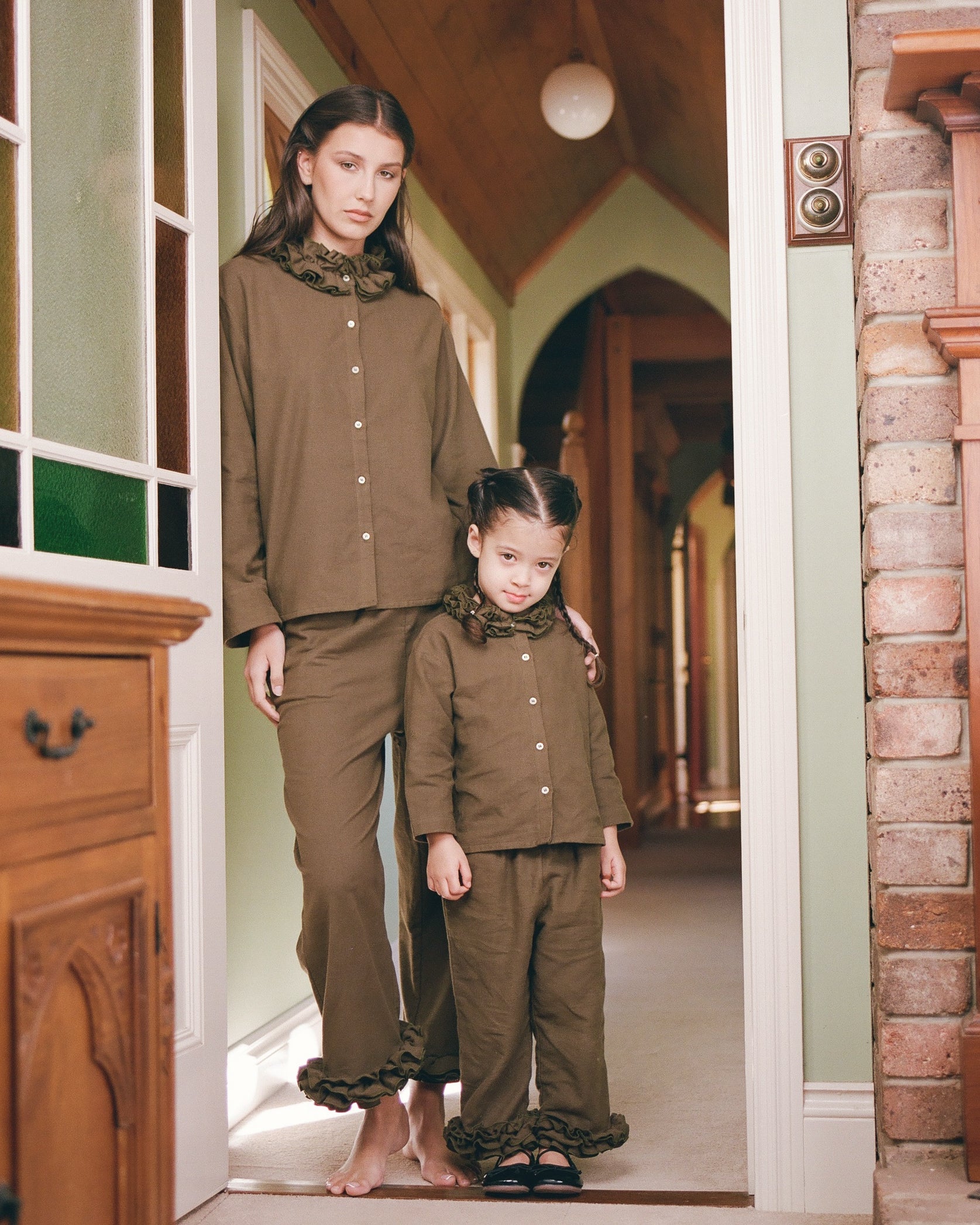 Made from 100% cotton and stitched with 100% organic cotton thread. Natural shell buttons.