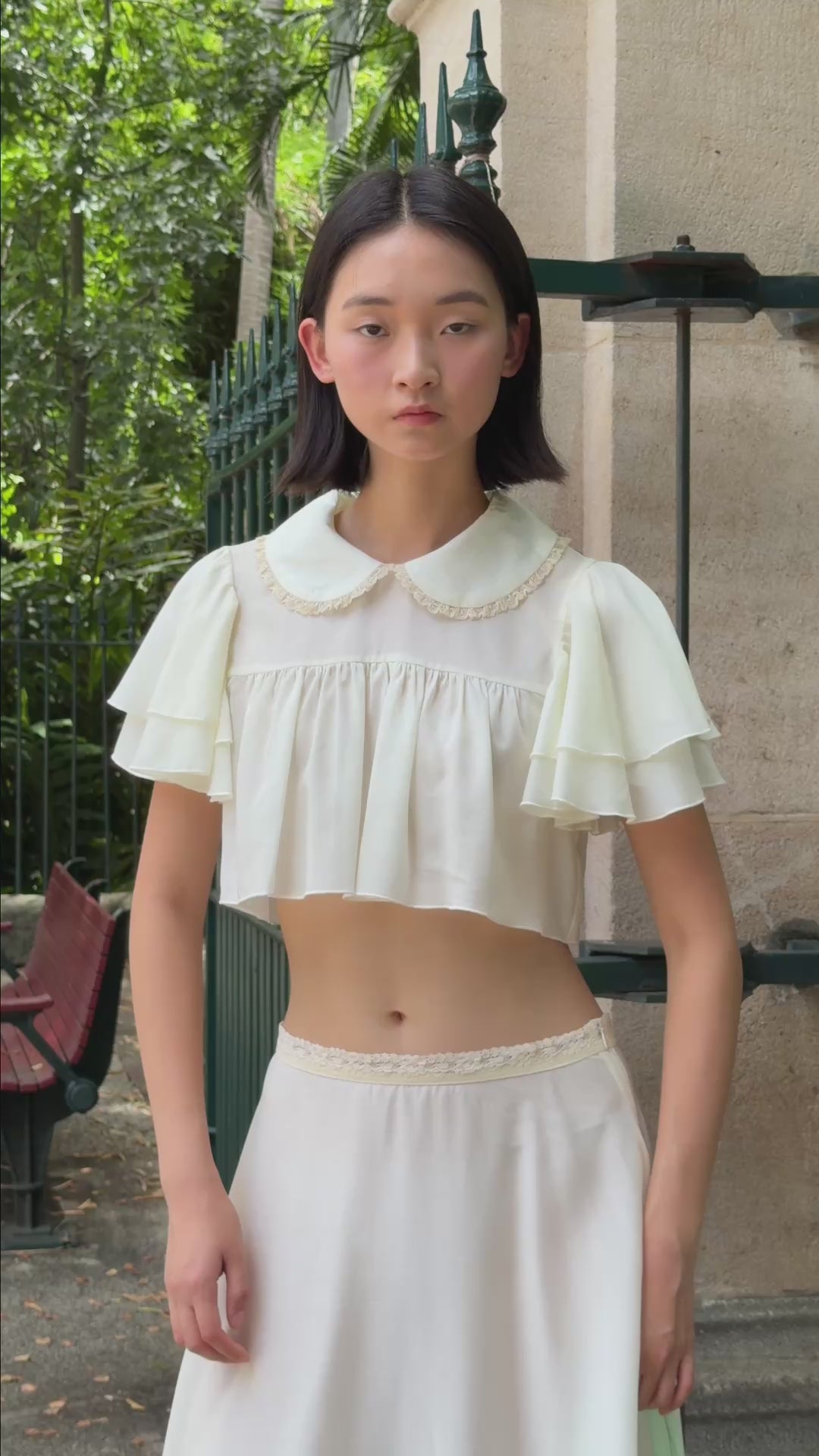 Cropped blouse featuring a rounded Peter Pan collar with lace trim, layered flutter sleeves, a gathered bodice, and a soft, flared hem.