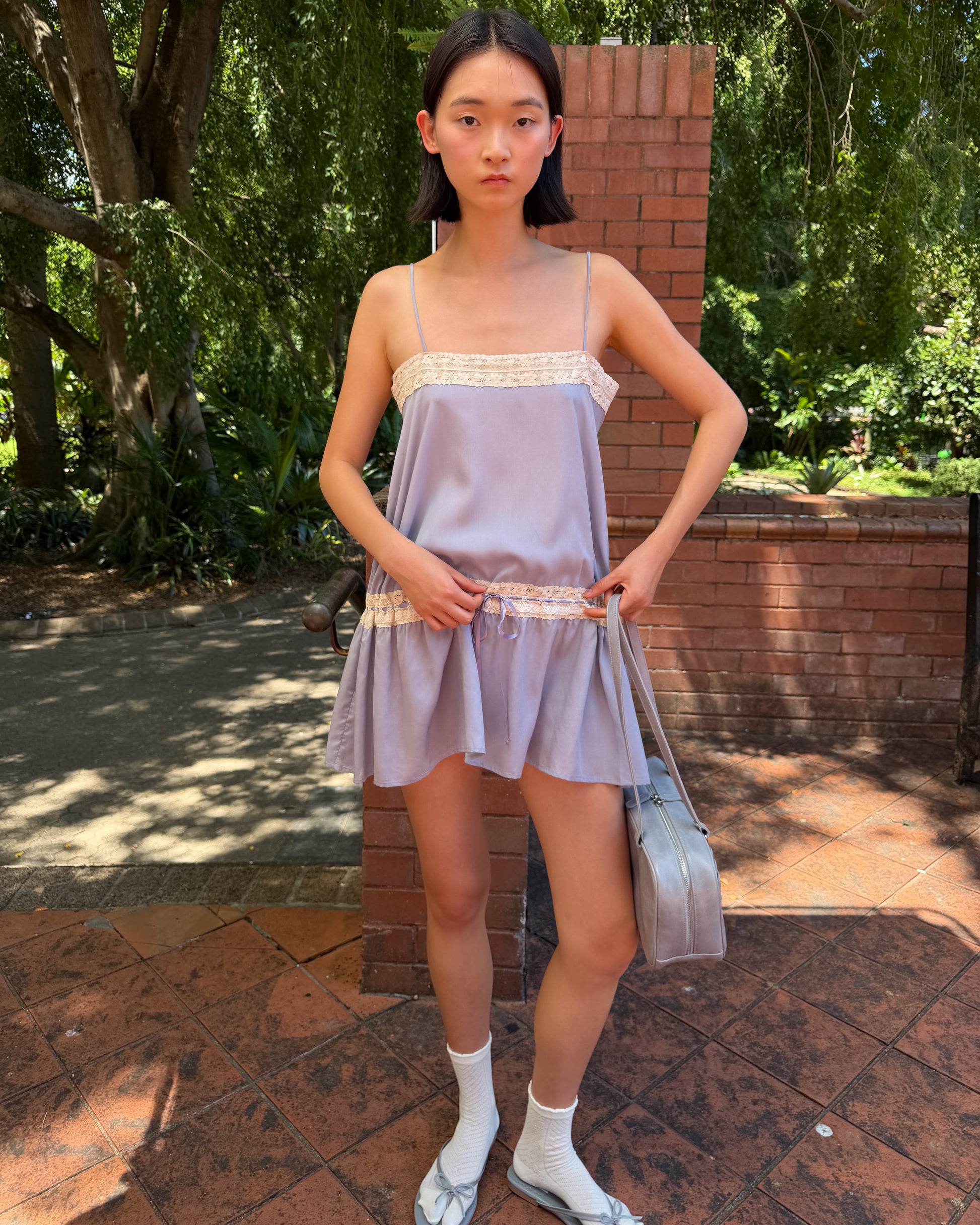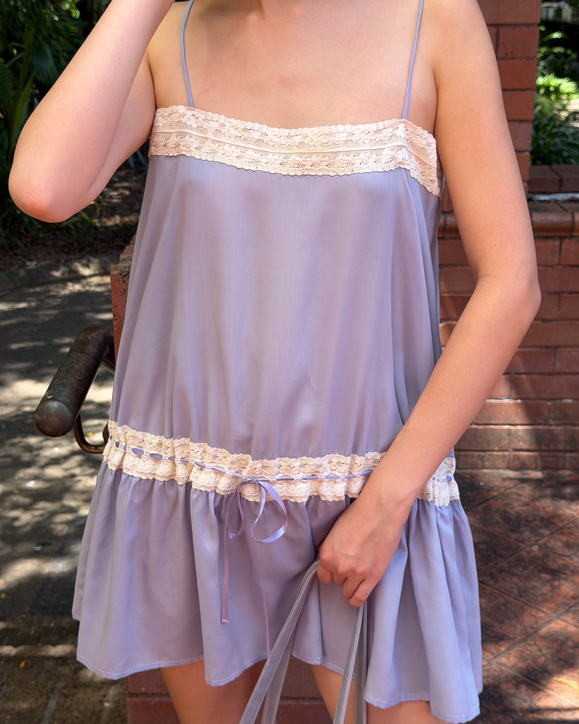 Loose babydoll dress with lace panels at the bust and waist. Features adjustable ribbon ties and a gathered hem. Finished with thin straps and a soft, draped silhouette.
