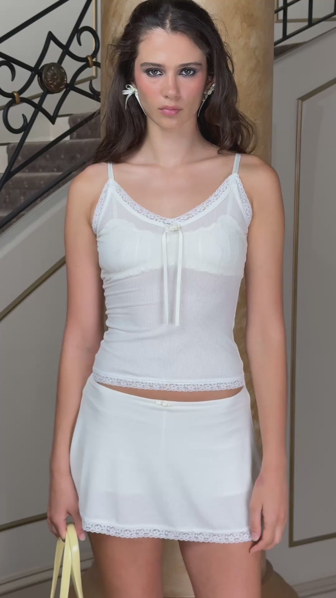 Skort featuring a soft rib-knit body, a smooth A-line silhouette, a petite front bow accent at the waistband, built-in shorts for comfort and coverage, and a delicate scalloped lace trim tracing the hem.