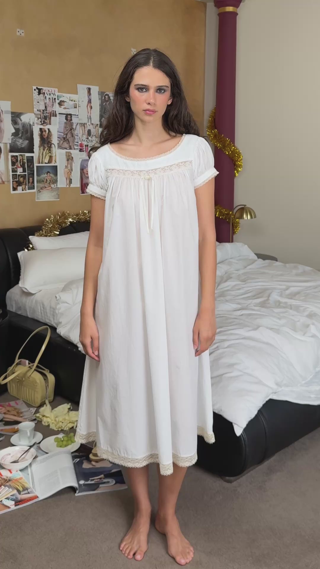 Gathered maxi dress gown with lace trim. Features a wide neckline with lace edging, short puff sleeves with lace cuffs, and a gathered bodice. Finished with a straight, long silhouette and lace trim at the hem.