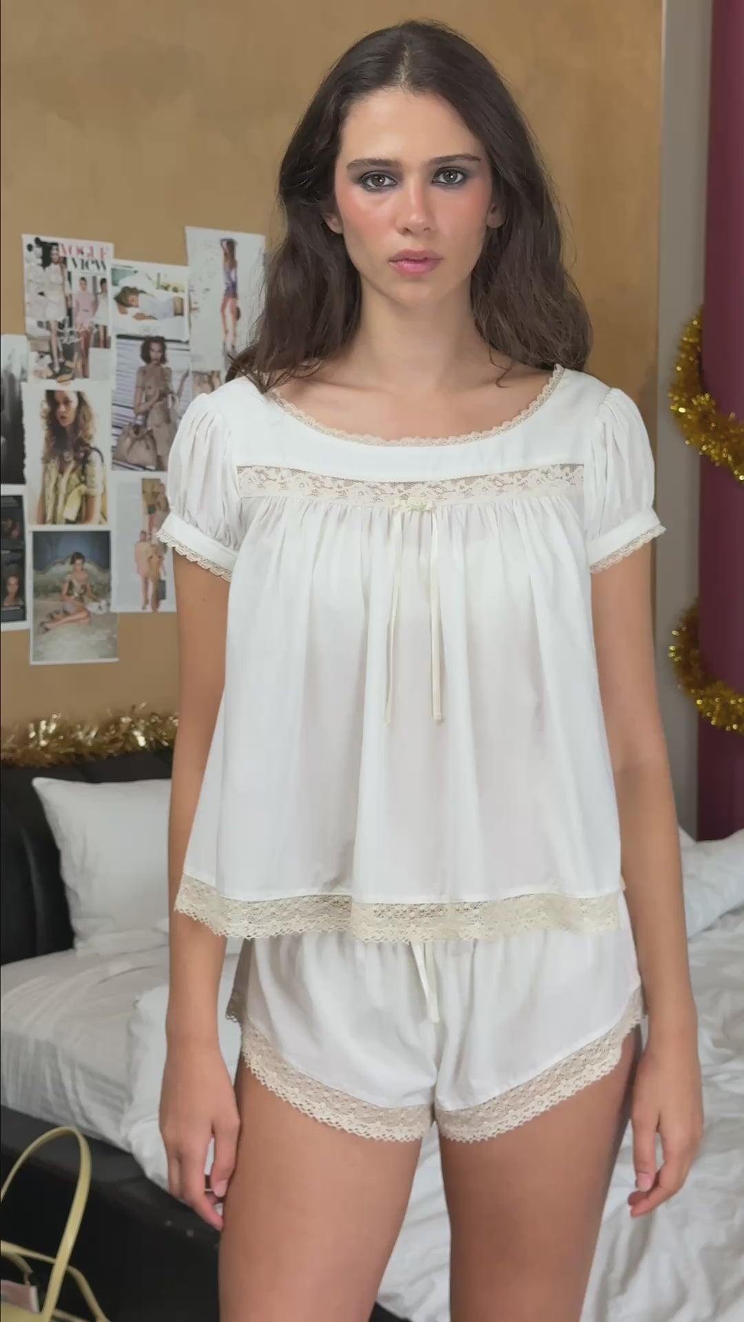 Features an elastic waistband with rosette and ribbon detail, and lace trim along the hem.