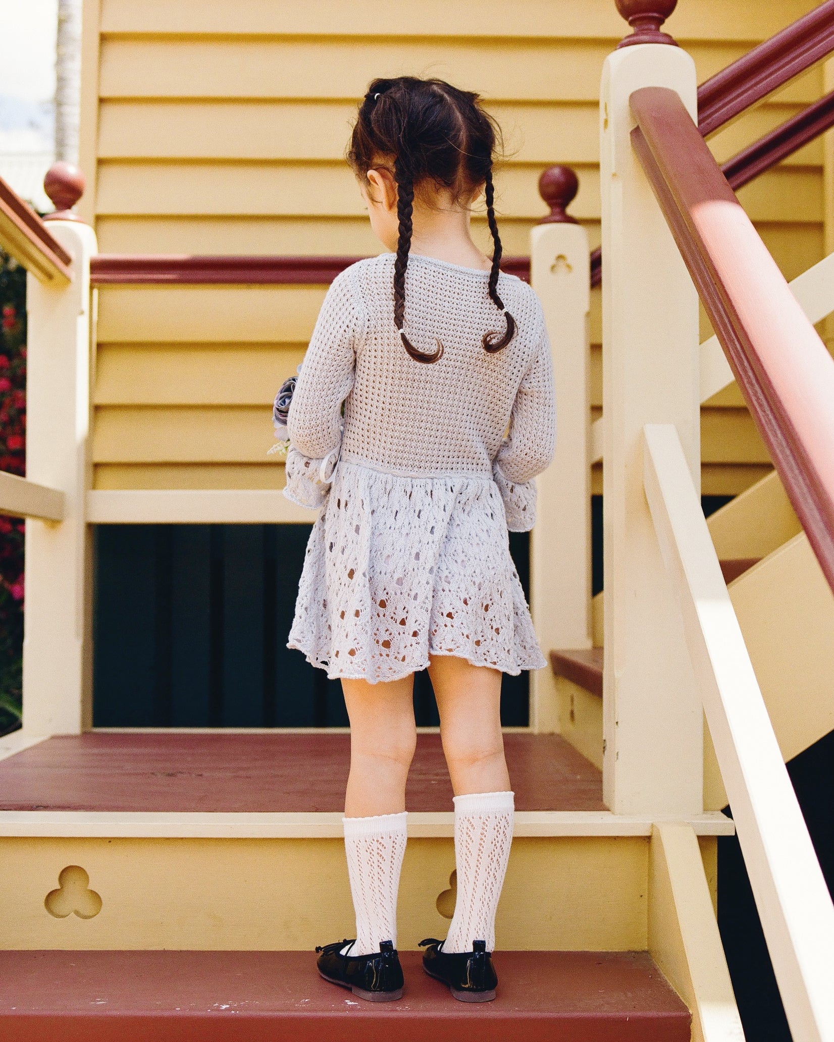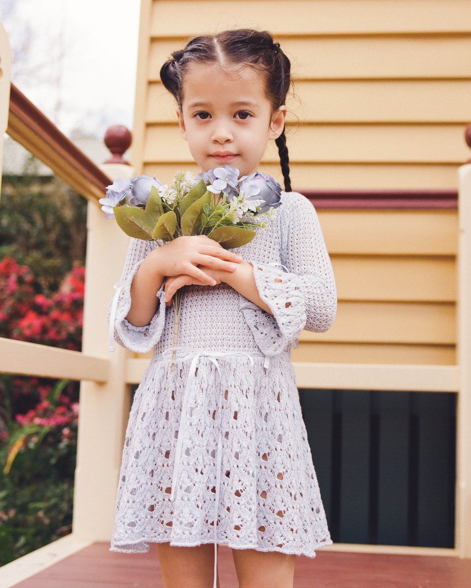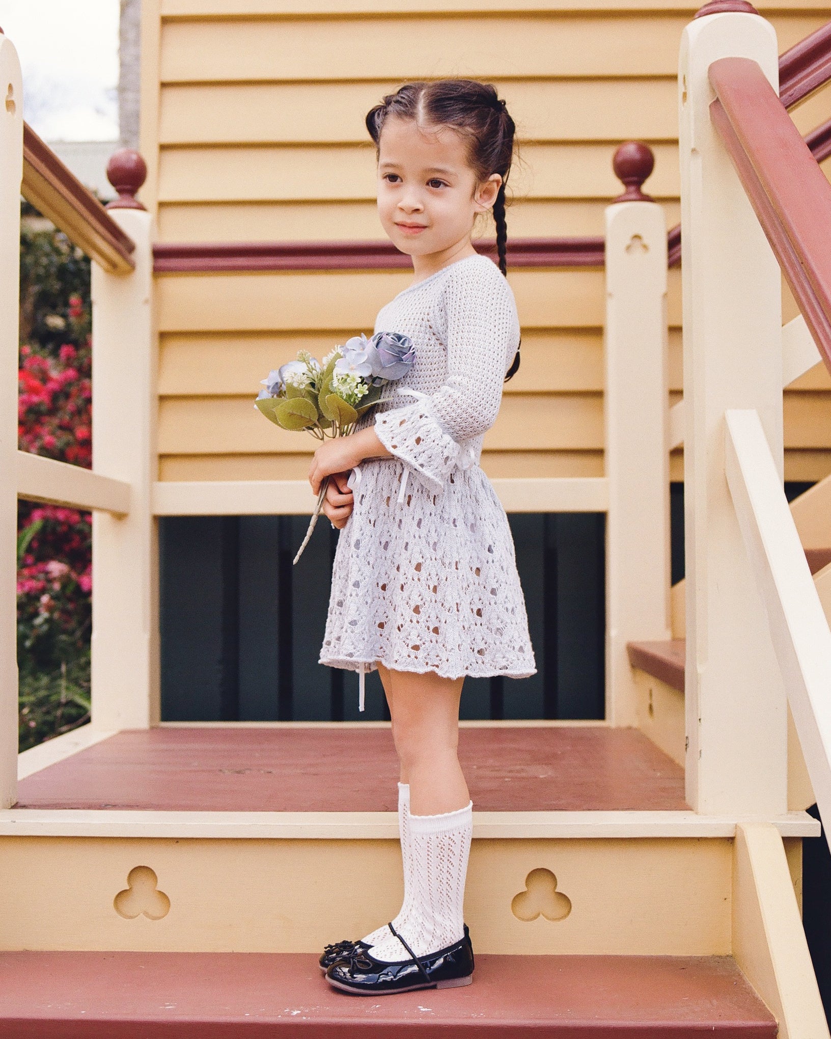 Textured waffle stitch at the upper body. Flared hem and sleeve cuffs finished with delicate lace-knit pattern. Ribbon ties at cuffs and waist offer subtle adjustability.