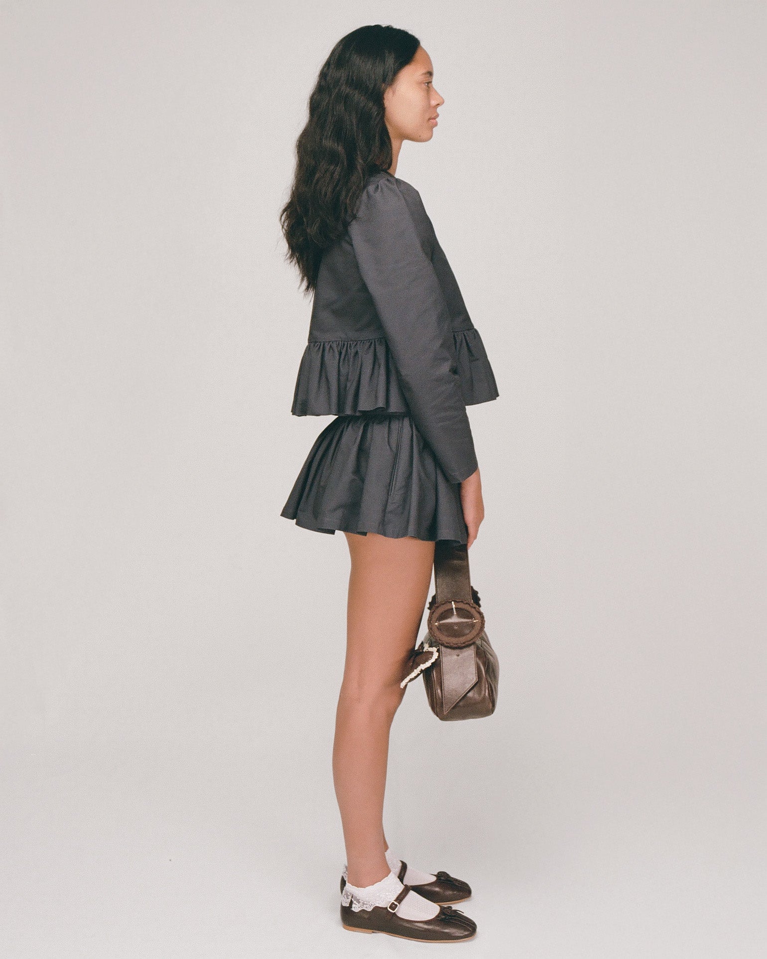 Structured peplum jacket with puffed shoulders and a rounded Peter Pan collar.