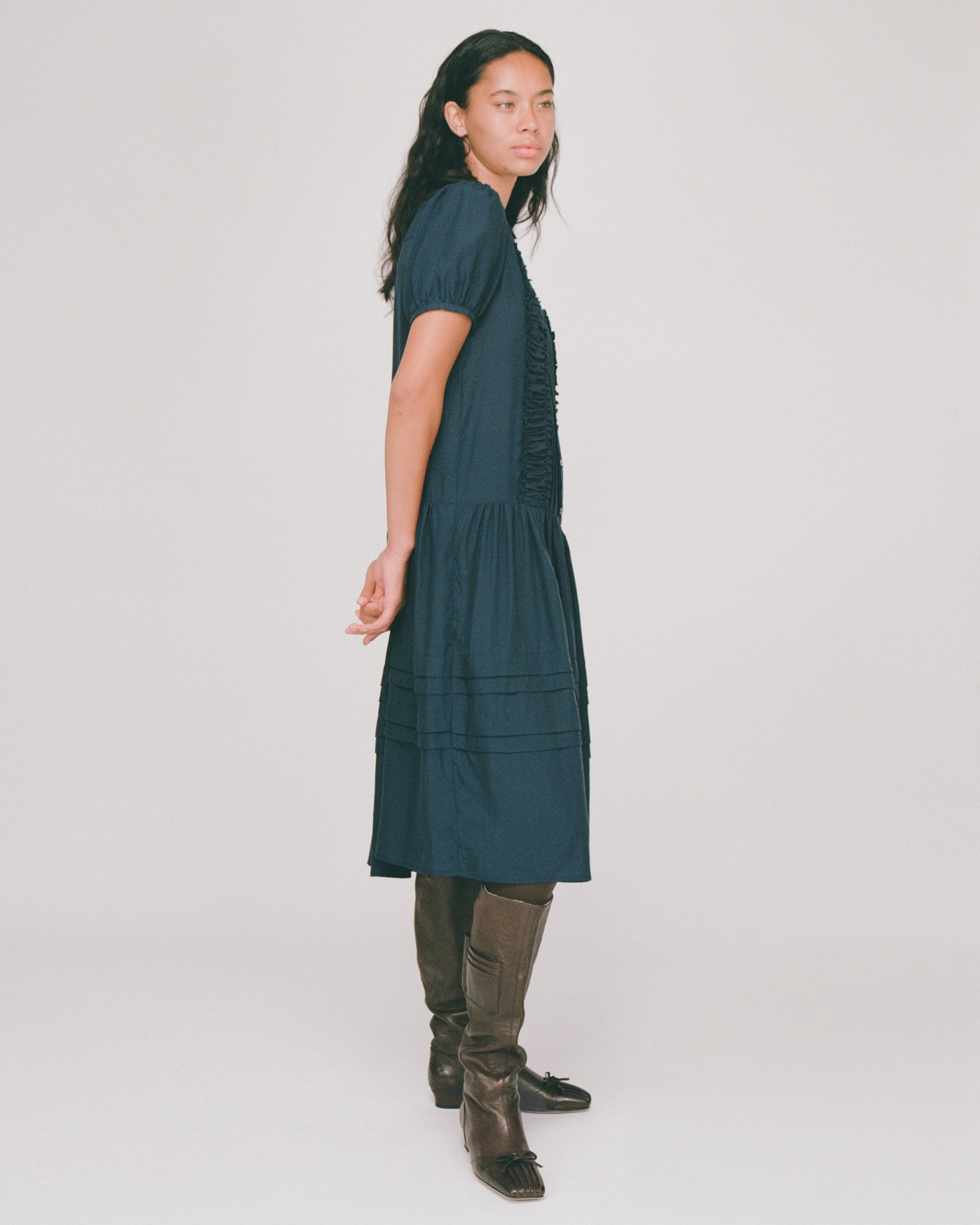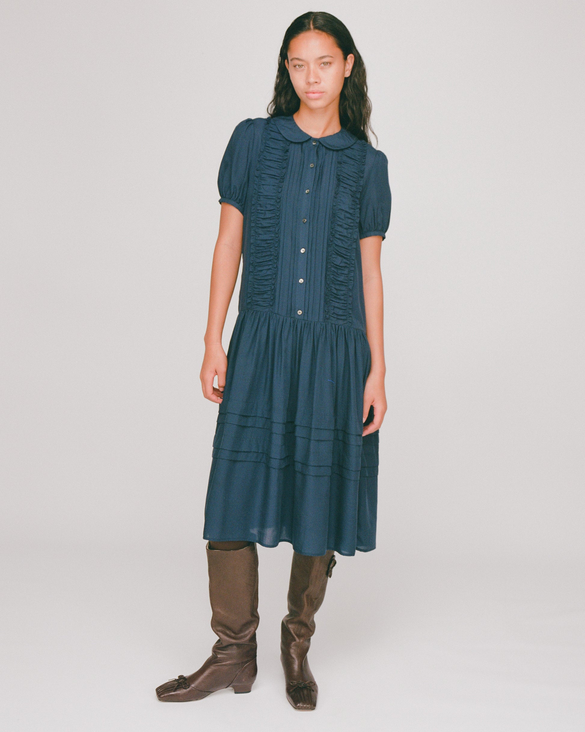 Vintage-inspired midi dress with a rounded Peter Pan collar and puffed short sleeves. Vertical pin-tucks and gathered ruffle detailing, with natural shell buttons down the front.