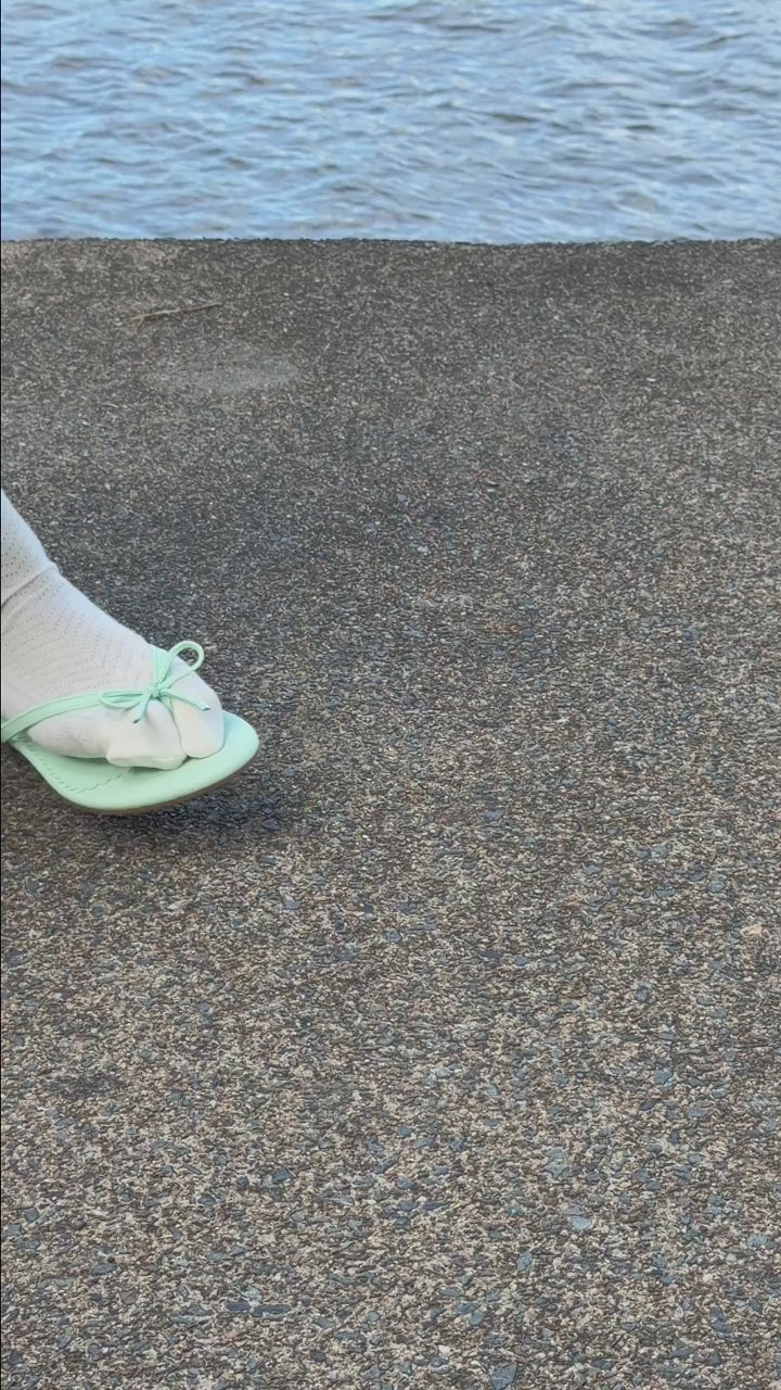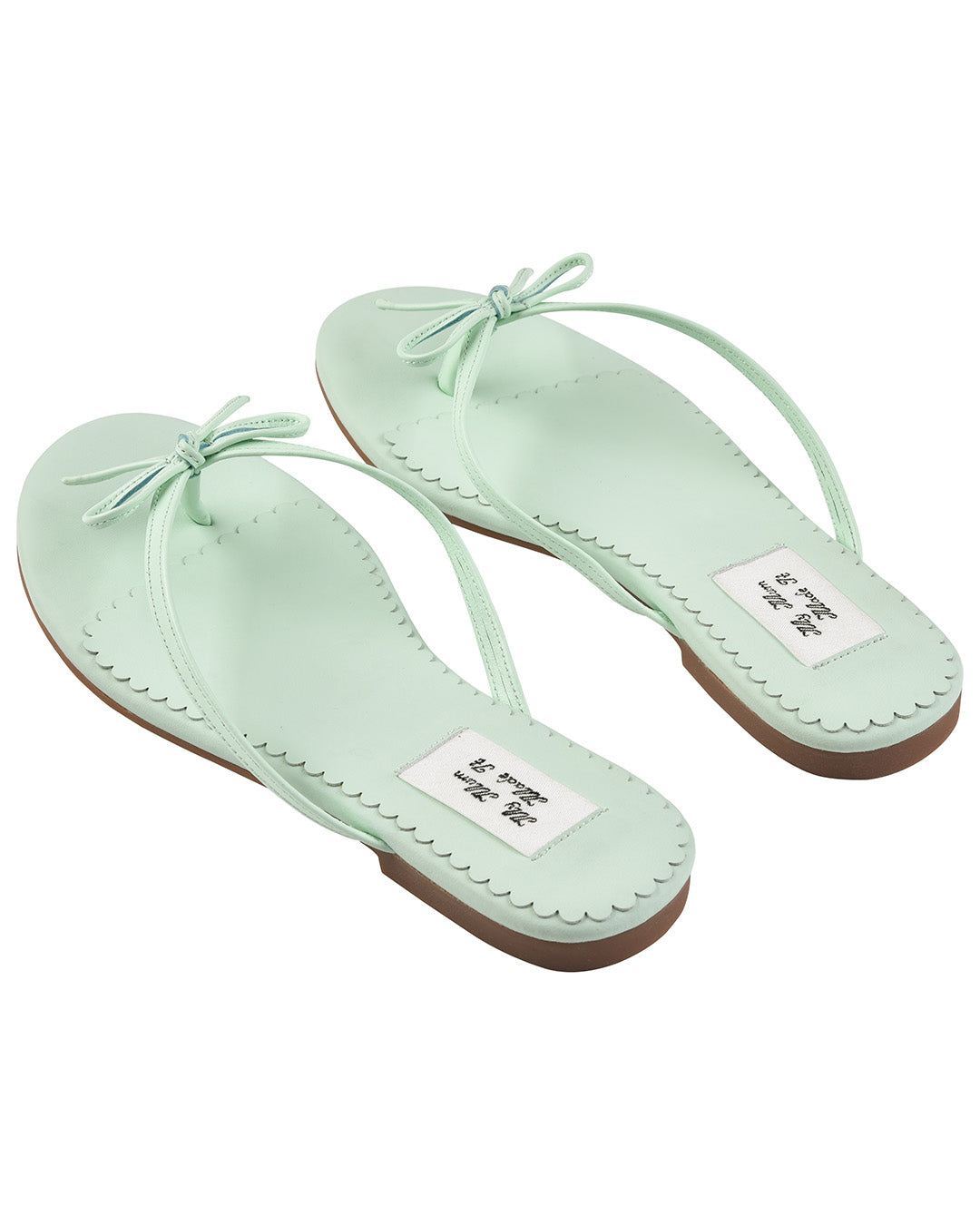 Thong-style sandals featuring slim straps, a front bow detail, and a scalloped insole edge. Finished with a flat sole and stitching detail.