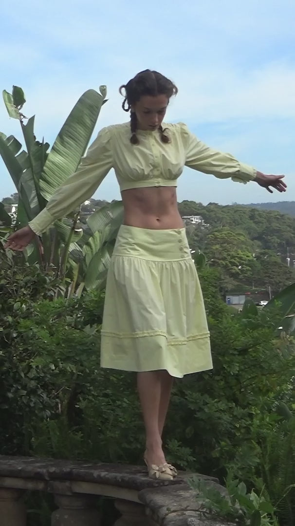 Pima Cotton Midi Skirt With Button Closure At Side. Ruche Detail Along Hem.
