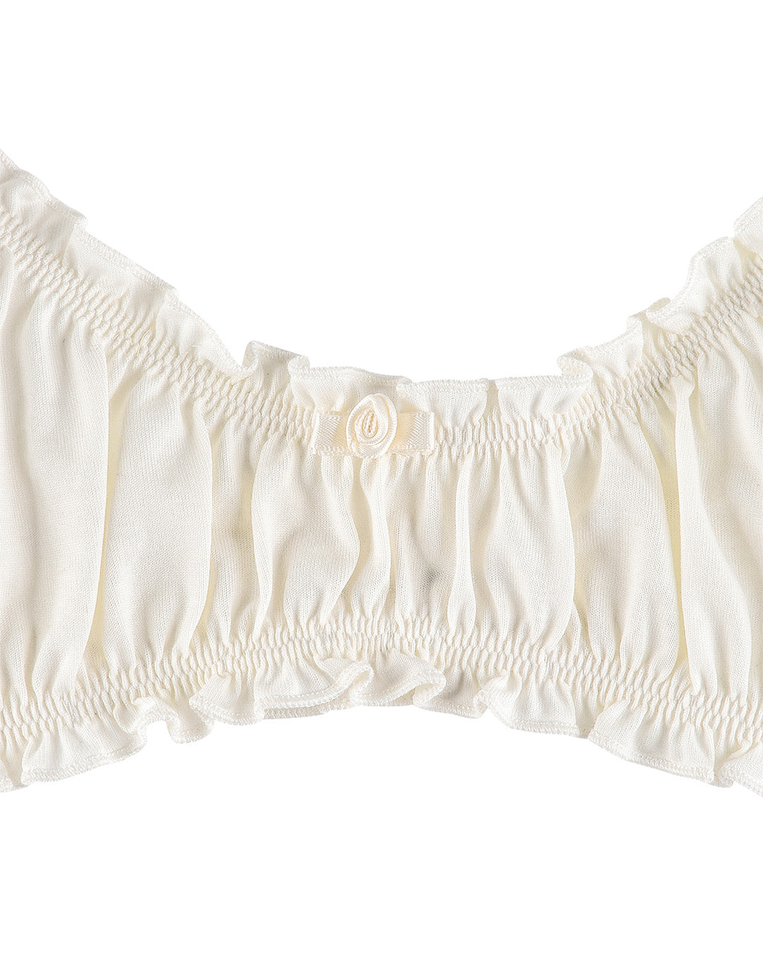 Ruched bralette with gathered cups, ruffled edges, thin adjustable straps, and a small rosette at the centre front.