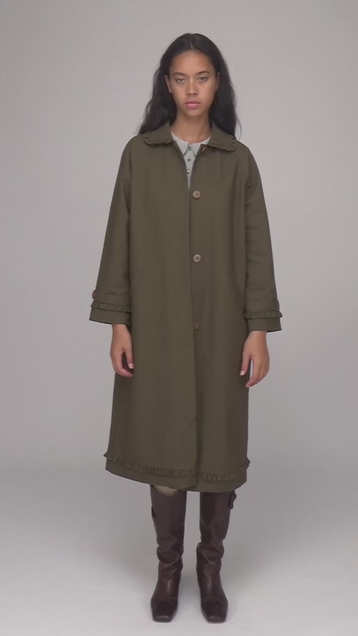 Subtle ruffle trim at collar, cuffs, and hem adds a soft, feminine touch.